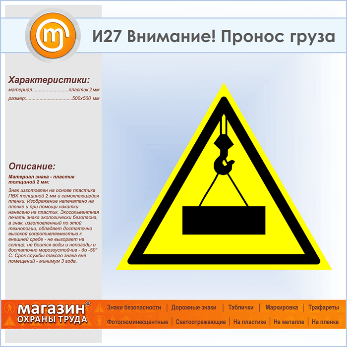 Знак «Внимание! Пронос груза», И27 (пластик, сторона 500 мм) в Томске купить