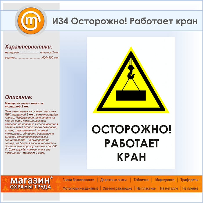 Знак «Осторожно! Работает кран», И34 (пластик, 600х900 мм) в Томске купить