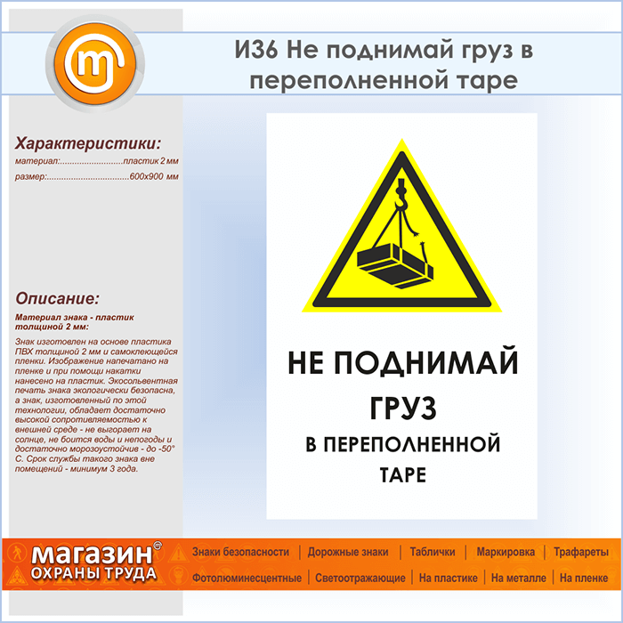 Знак «Не поднимай груз в переполненной таре», И36 (пластик, 600х900 мм) в Томске купить