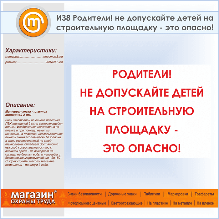 Знак «Родители! не допускайте детей на строительную площадку - это опасно!», И38 (пластик, 900х600 мм) в Томске купить