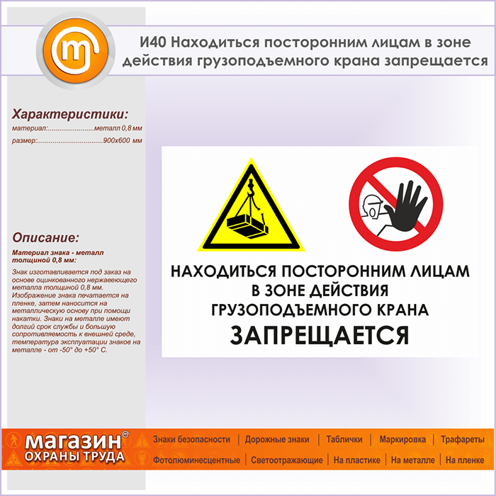Знак «Находиться посторонним лицам в зоне действия грузоподъемного крана запрещается», И40 (металл, 900х600 мм) в Томске купить