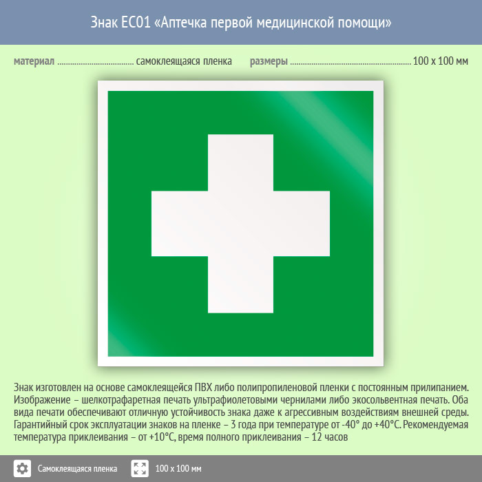 Знак EC01 «Аптечка первой медицинской помощи» (пленка, 100х100 мм) в Томске купить