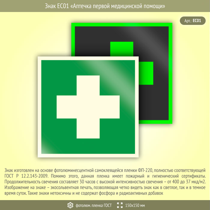 Знак EC01 «Аптечка первой медицинской помощи» (фотолюминесцентная пленка ГОСТ 34428-2018, 150х150 мм) в Томске купить