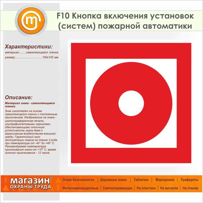 Знак F10 «Кнопка включения установок (систем) пожарной автоматики» (пленка, 100х100 мм) в Томске купить