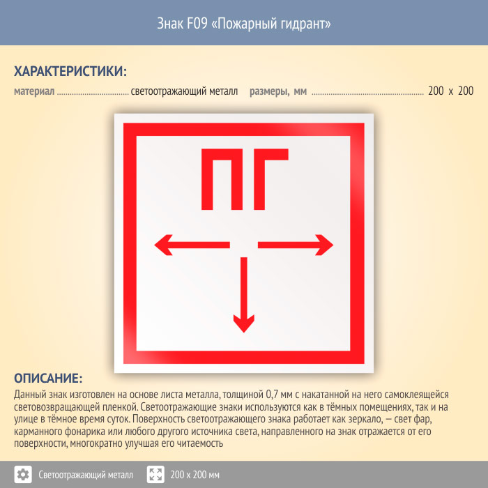 Знак F09 «Пожарный гидрант» (светоотражающий металл, 200х200 мм) в Томске купить