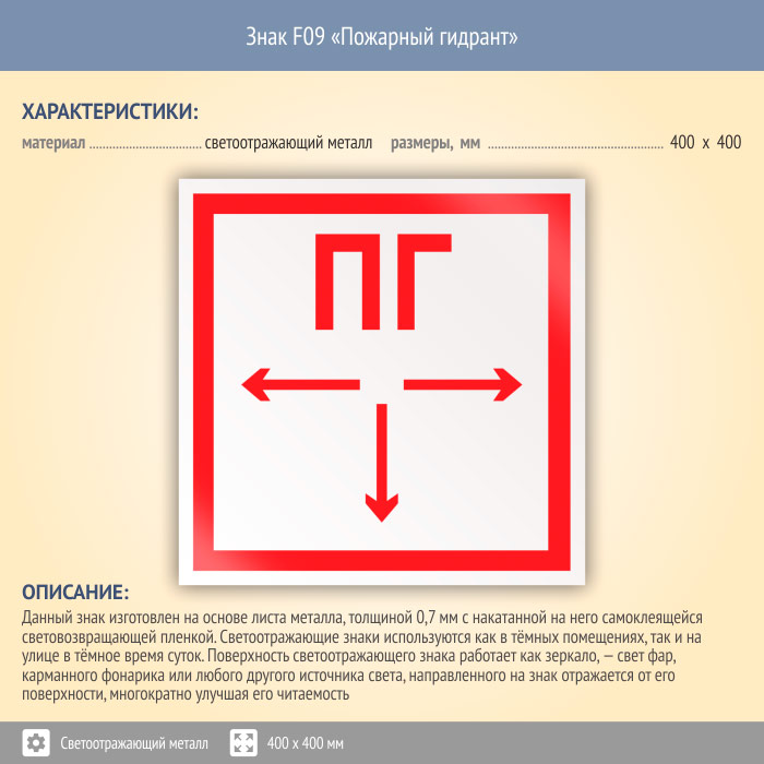 Знак F09 «Пожарный гидрант» (светоотражающий металл, 400х400 мм) в Томске купить