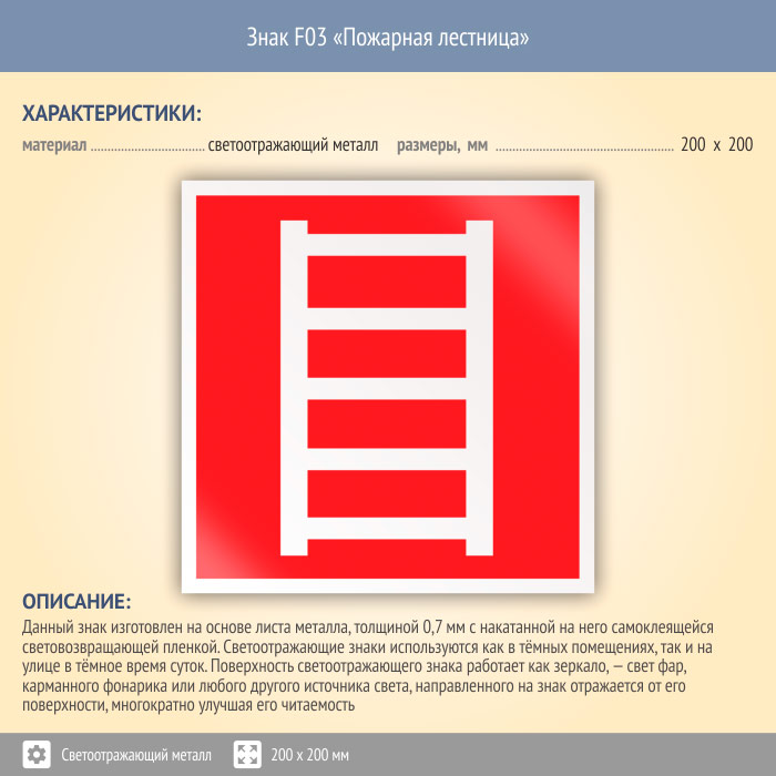 Знак F03 «Пожарная лестница» (светоотражающий металл, 200х200 мм) в Томске купить
