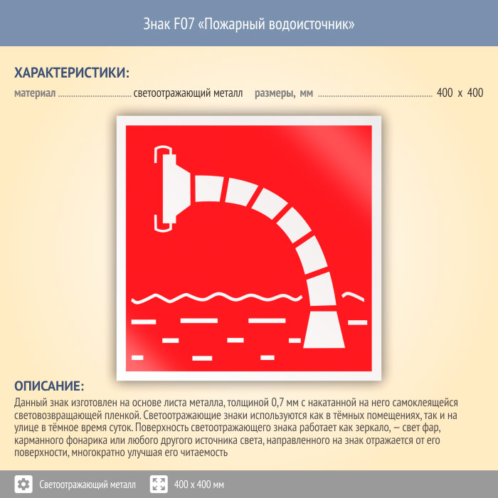 Знак F07 «Пожарный водоисточник» (светоотражающий металл, 400х400 мм) в Томске купить