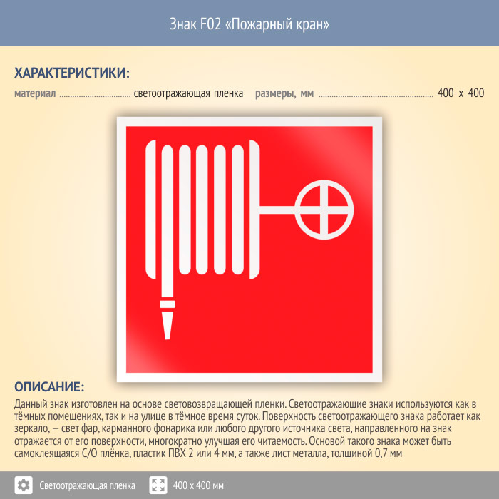 Знак F02 «Пожарный кран» (светоотражающая пленка, 400х400 мм) в Томске купить