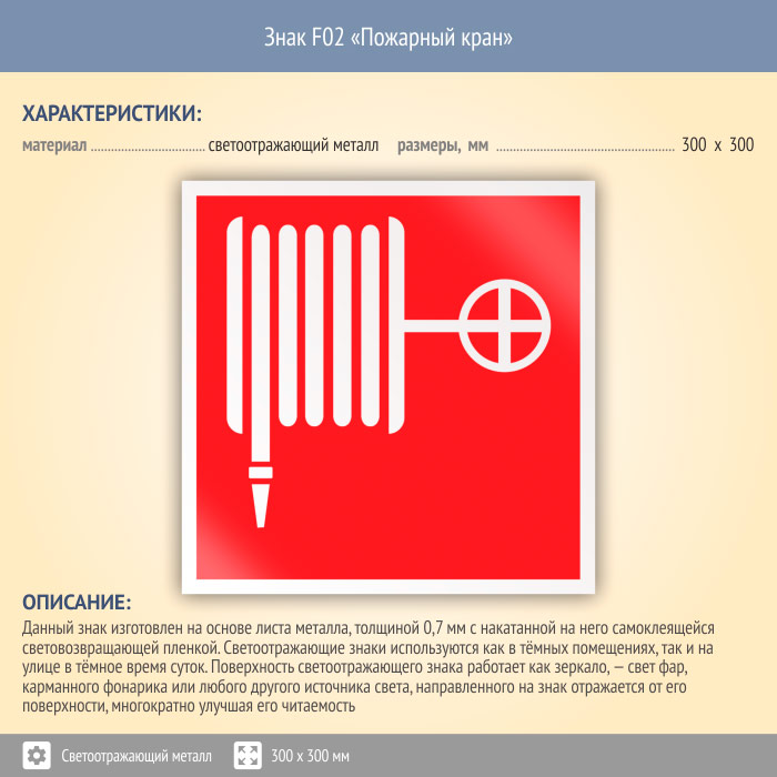 Знак F02 «Пожарный кран» (светоотражающий металл, 300х300 мм) в Томске купить