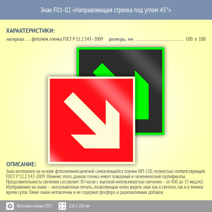 Знак F01-02 «Направляющая стрелка под углом 45°» (фотолюминесцентная пленка ГОСТ 34428-2018, 100х100 мм) в Томске купить