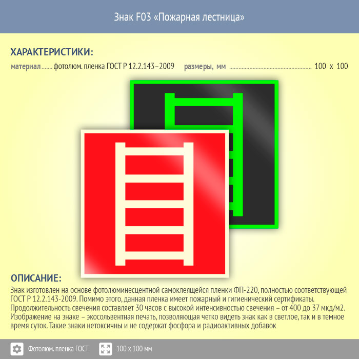 Знак F03 «Пожарная лестница» (фотолюминесцентная пленка ГОСТ 34428-2018, 100х100 мм) в Томске купить
