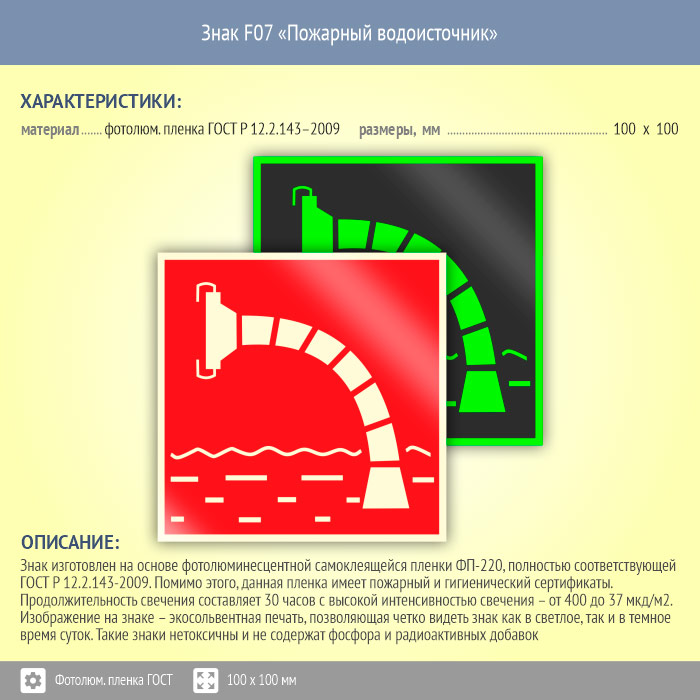 Знак F07 «Пожарный водоисточник» (фотолюминесцентная пленка ГОСТ 34428-2018, 100х100 мм) в Томске купить