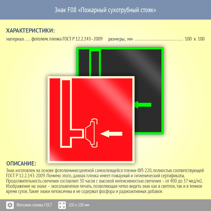 Знак F08 «Пожарный сухотрубный стояк» (фотолюминесцентная пленка ГОСТ 34428-2018, 100х100 мм) в Томске купить