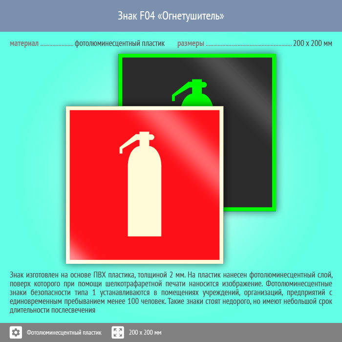 Знак F04 «Огнетушитель» (фотолюминесцентный пластик, 200х200 мм) в Томске купить
