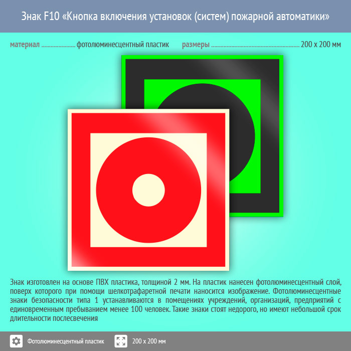 Знак F10 «Кнопка включения установок (систем) пожарной автоматики» (фотолюминесцентный пластик, 200х200 мм) в Томске купить