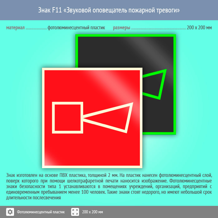 Знак F11 «Звуковой оповещатель пожарной тревоги» (фотолюминесцентный пластик, 200х200 мм) в Томске купить