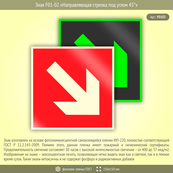 Знак F01-02 «Направляющая стрелка под углом 45°» (фотолюминесцентная пленка ГОСТ 34428-2018, 150х150 мм) в Томске купить