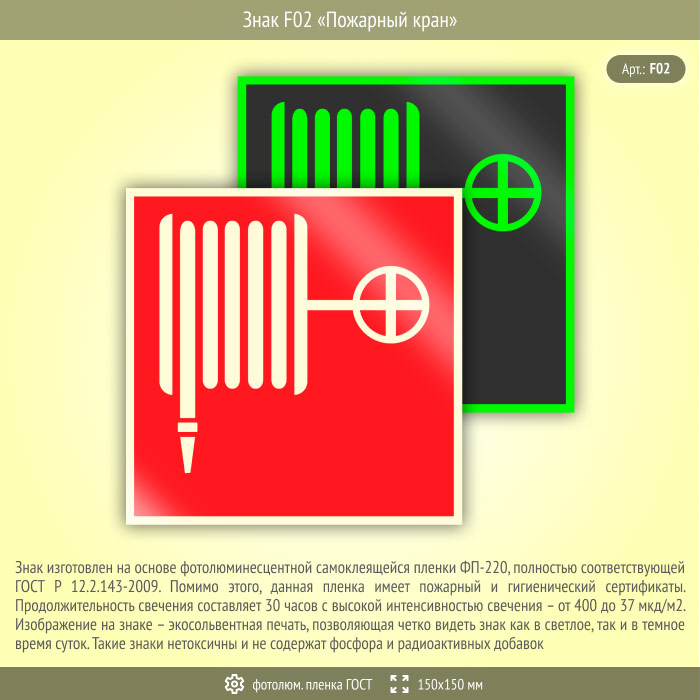 Знак F02 «Пожарный кран» (фотолюминесцентная пленка ГОСТ 34428-2018, 150х150 мм) в Томске купить
