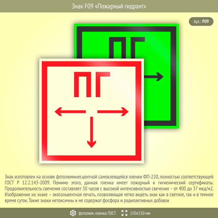 Знак F09 «Пожарный гидрант» (фотолюминесцентная пленка ГОСТ 34428-2018, 150х150 мм) в Томске купить