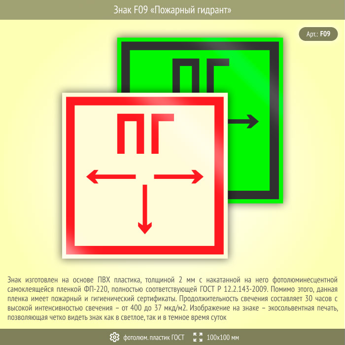 Знак F09 «Пожарный гидрант» (фотолюминесцентный пластик ГОСТ 34428-2018, 100х100 мм) в Томске купить