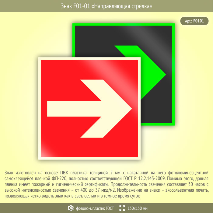 Знак F01-01 «Направляющая стрелка» (фотолюминесцентный пластик ГОСТ 34428-2018, 150х150 мм) в Томске купить