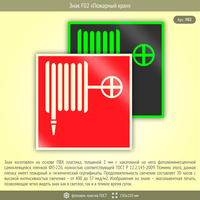 Знак F02 «Пожарный кран» (фотолюминесцентный пластик ГОСТ 34428-2018, 150х150 мм) в Томске купить