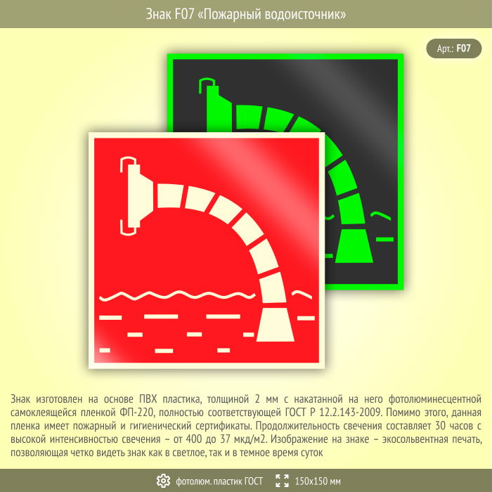 Знак F07 «Пожарный водоисточник» (фотолюминесцентный пластик ГОСТ 34428-2018, 150х150 мм) в Томске купить