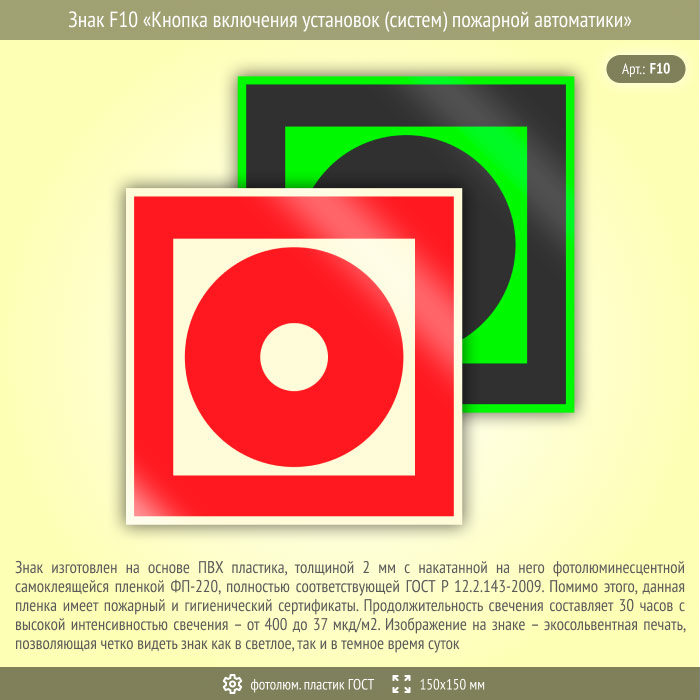 Знак F10 «Кнопка включения установок (систем) пожарной автоматики» (фотолюминесцентный пластик ГОСТ 34428-2018, 150х150 мм) в Томске купить