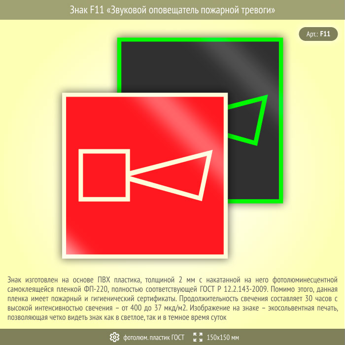 Знак F11 «Звуковой оповещатель пожарной тревоги» (фотолюминесцентный пластик ГОСТ 34428-2018, 150х150 мм) в Томске купить