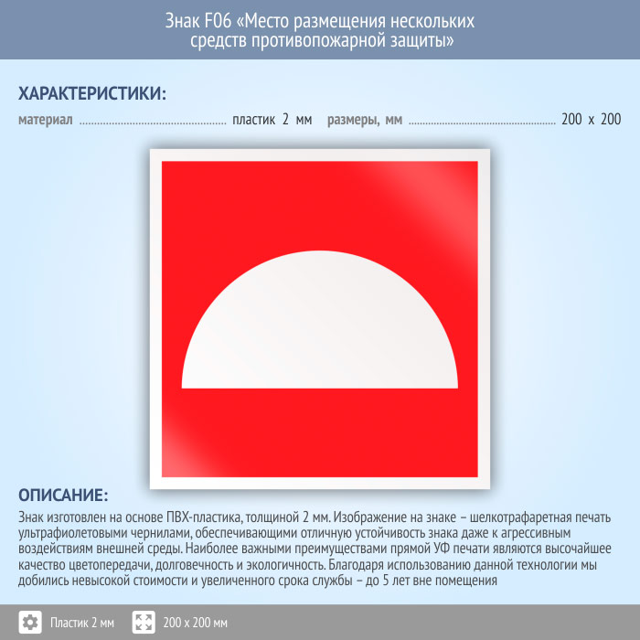 Знак F06 «Место размещения нескольких средств противопожарной защиты» (пластик, 200х200 мм) в Томске купить