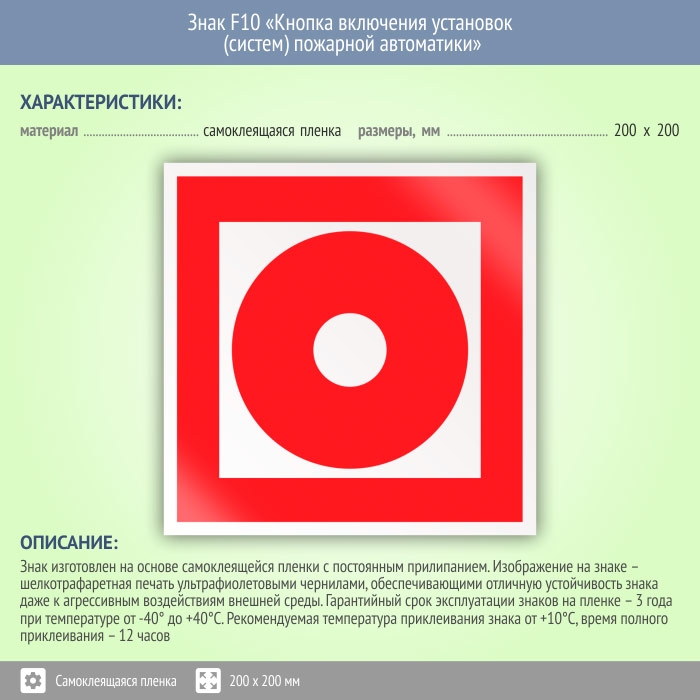 Знак F10 «Кнопка включения установок (систем) пожарной автоматики» (пленка, 200х200 мм) в Томске купить