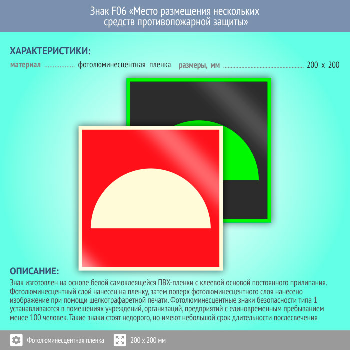 Знак F06 «Место размещения нескольких средств противопожарной защиты» (фотолюминесцентная пленка, 200х200 мм) в Томске купить