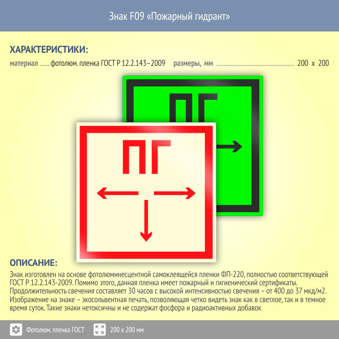 Знак F09 «Пожарный гидрант» (фотолюминесцентная пленка ГОСТ 34428-2018, 200х200 мм) в Томске купить