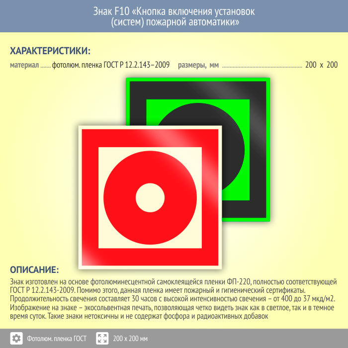 Знак F10 «Кнопка включения установок (систем) пожарной автоматики» (фотолюминесцентная пленка ГОСТ 34428-2018, 200х200 мм) в Томске купить