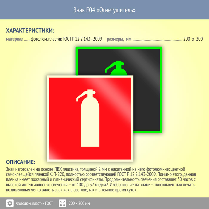 Знак F04 «Огнетушитель» (фотолюминесцентный пластик ГОСТ 34428-2018, 200х200 мм) в Томске купить