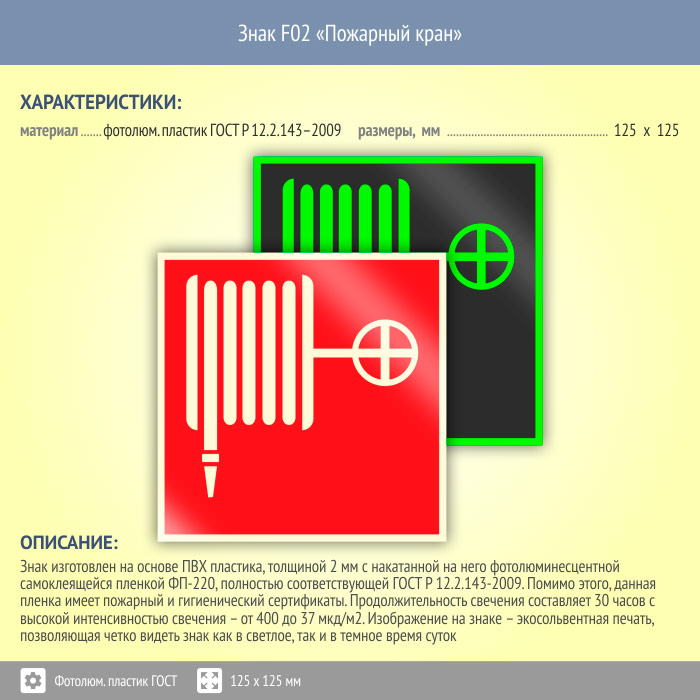 Знак F02 «Пожарный кран» (фотолюминесцентный пластик ГОСТ 34428-2018, 125х125 мм) в Томске купить