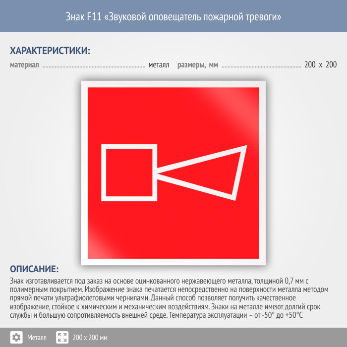 Знак F11 «Звуковой оповещатель пожарной тревоги» (металл, 200х200 мм) в Томске купить